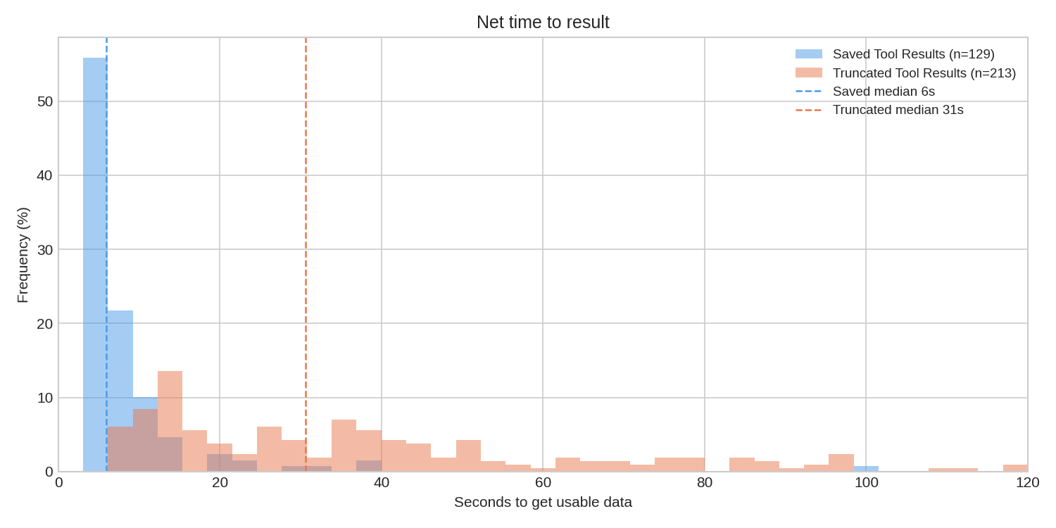 By saving the query result, we avoid expensive round trips through the data lake. Queries that blow out token limits are often ones that also are expensive to execute, so this has major benefits. The execution of a jq filter using the superb gojq implementation is extremely quick, so we have seen the median time to getting useful data drop by about 5x, from 31s to 6s; that 6s is virtually entirely LLM thinking time now.