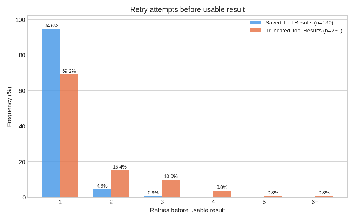 As mentioned above, it writes thoroughly sophisticated jq filters, as well, which generally mean it gets its answer in one try rather than multiple. With truncation, the agent has to try to guess at the right move to make to trim down the result set, but it is not really given expressive enough tools to browse and analyze the data. With saved artifacts, we've found that the LLM one-shots its analysis in 94% of cases. Truncation performed much worse: