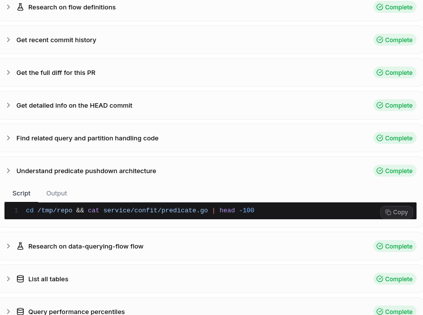 Things really started crackling into high quality once we gave our agent access to Bash tooling and the source code and Git history. With these capabilities, we're able to get a rich sense of the history of code changes and code efforts, and search for exact log text to craft very precise signals that indicate whether a PR has succeeded in its intent.
