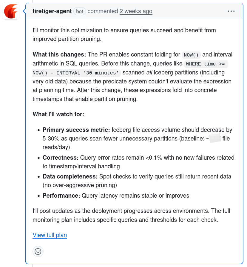 So, we configured the agent to work entirely through interactions on GitHub. To summon it, you mention "@firetiger" in a comment on a PR; it develops a plan and gives you a quick summary: