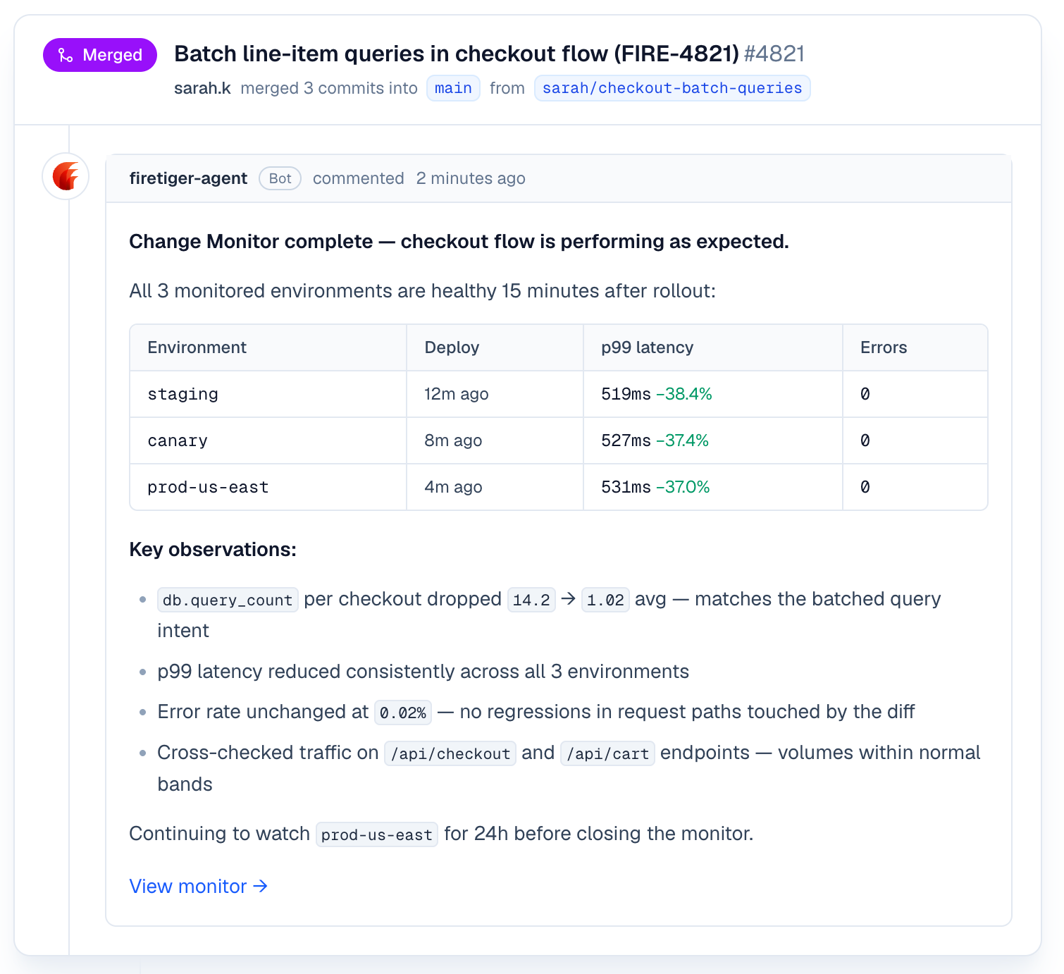 If you are already a Firetiger user, Change Monitors are available for every project today. Your next PR is one @firetiger comment away from its first monitor, or zero if you turn auto-monitoring on.