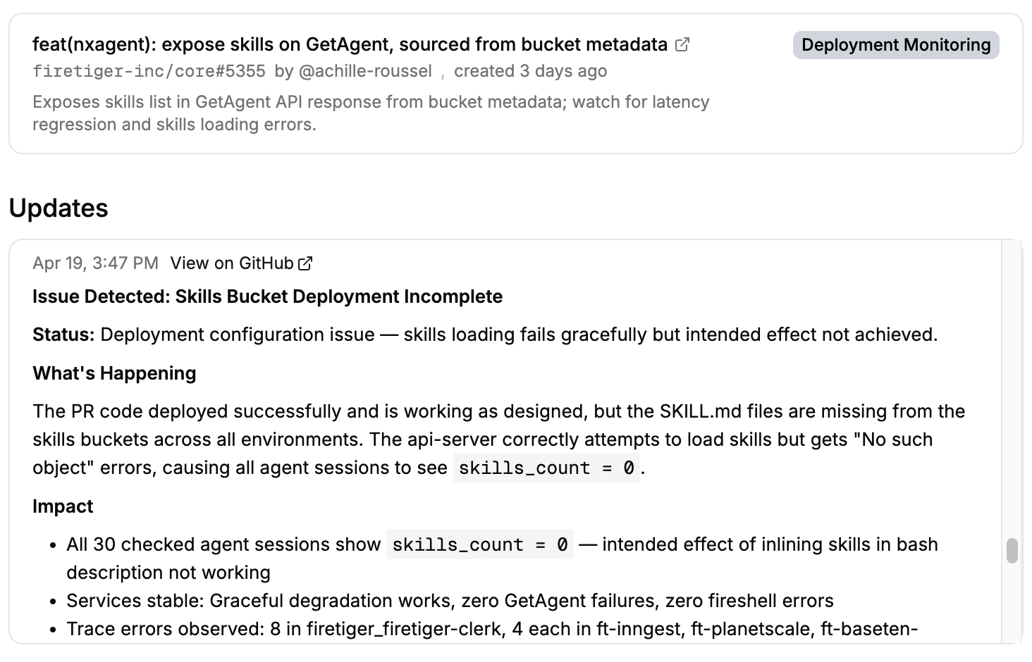 At each checkpoint, the agent queries your telemetry against the plan. It looks for the intended effects (did latency actually drop?) and for the unintended ones (is the error rate on this service higher than it was an hour before the deploy?). When the agent finds something, it opens an Issue in your Firetiger project with evidence attached, and it posts back on the PR. When it confirms the intended effect, it posts that too.