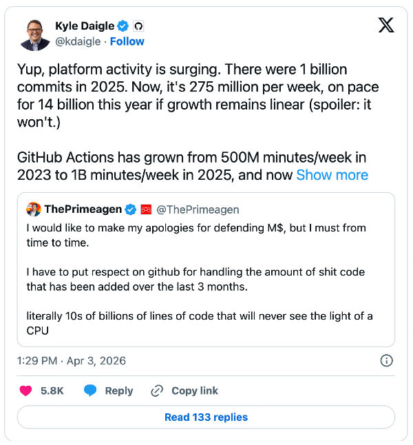 Now! The bottleneck around writing code is gone. Between agents, agents, and more agents, the rate at which code can be produced and reviewed has jumped by something like an order of magnitude in a year.