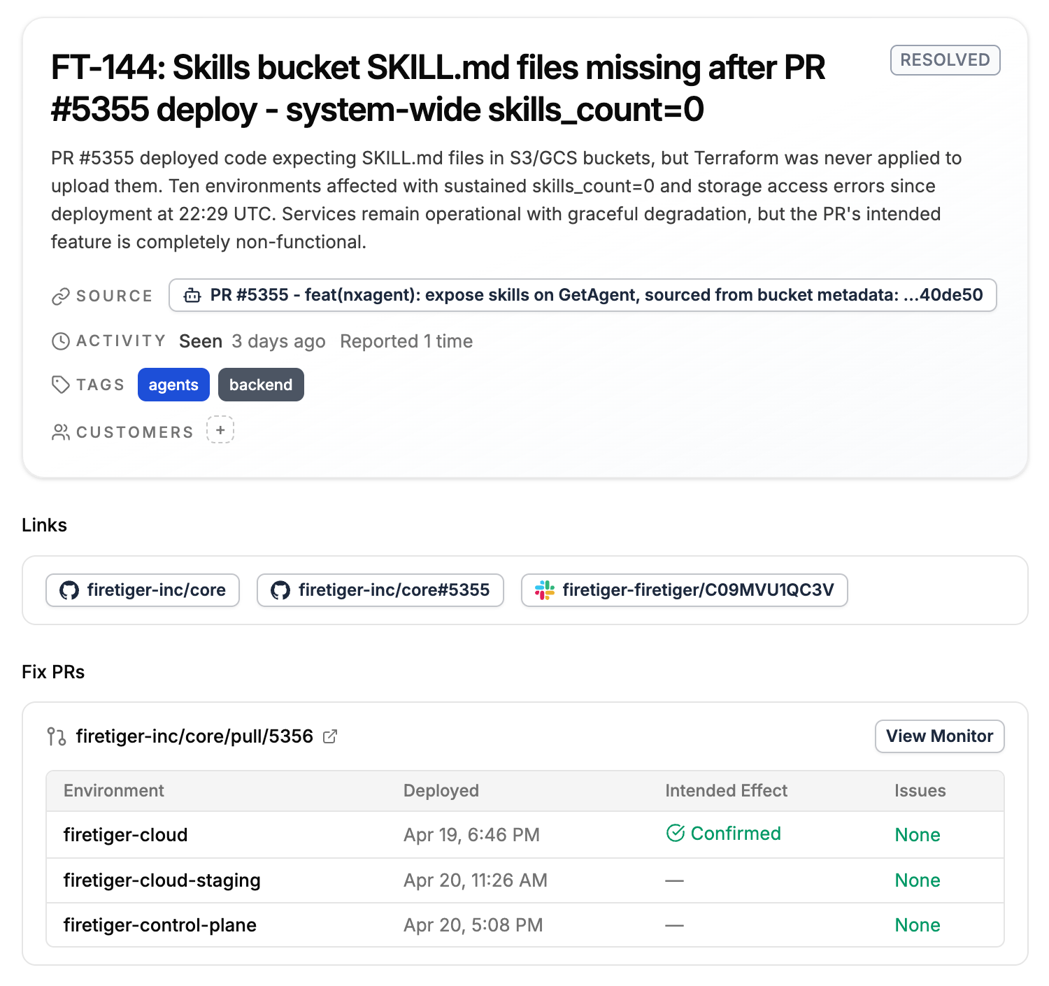 They pair naturally with Firetiger's existing agent ecosystem. Issues filed by a Change Monitor can flow into Agent SLO dashboards, and they can be routed to Fix in Cursor or the Firetiger plugin for Claude Code to go from detection to a proposed pull request in one click.