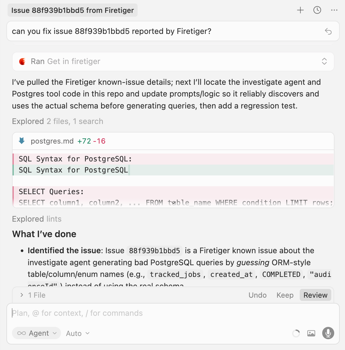 - the Firetiger plugin gave Cursor simple access to the issue description