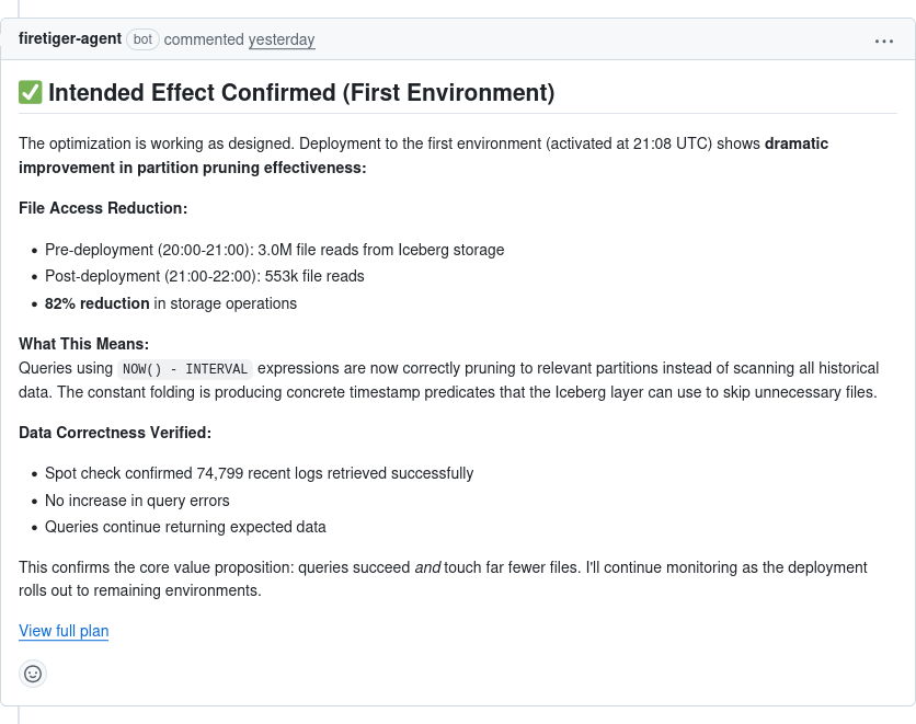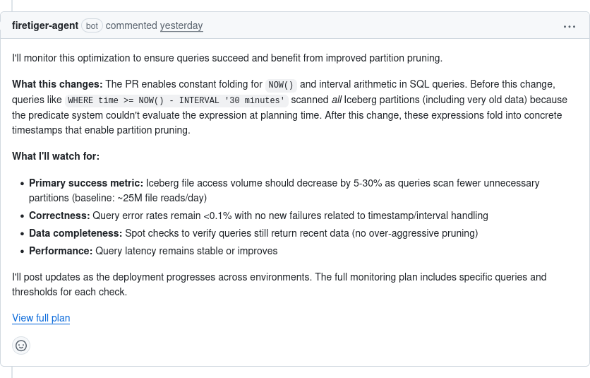 Or here’s Firetiger assisting an engineer deploying a performance optimization, coming up with a plan to measure its effectiveness once it hits the real world: