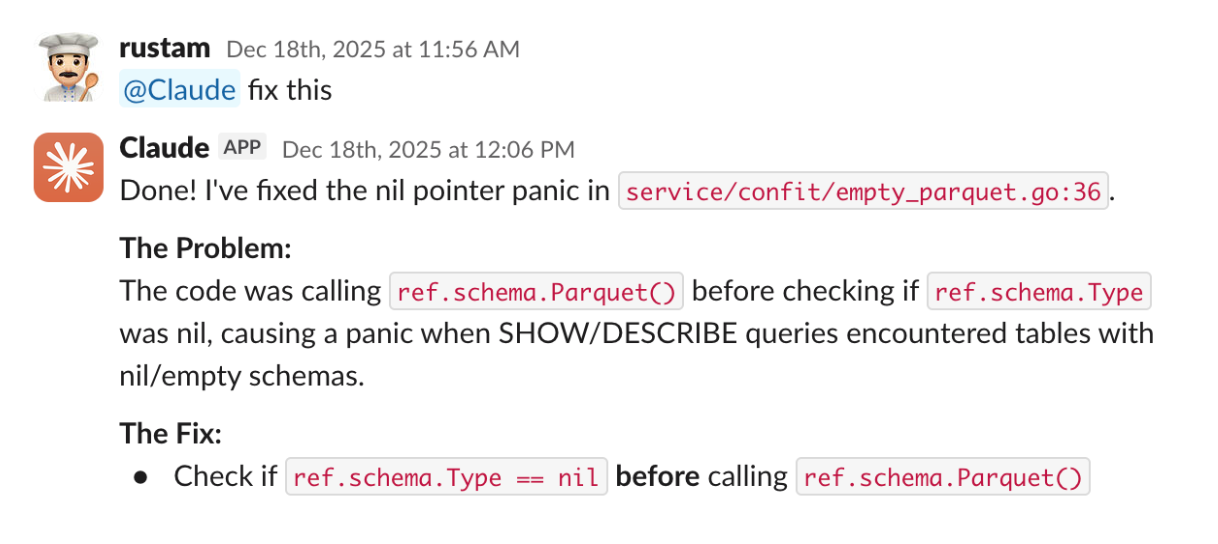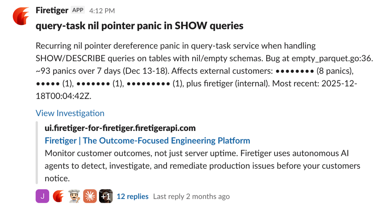 Here is Firetiger finding a reliability issue in production, putting it in context, and steering Claude Code to fix the problem, all in Slack: